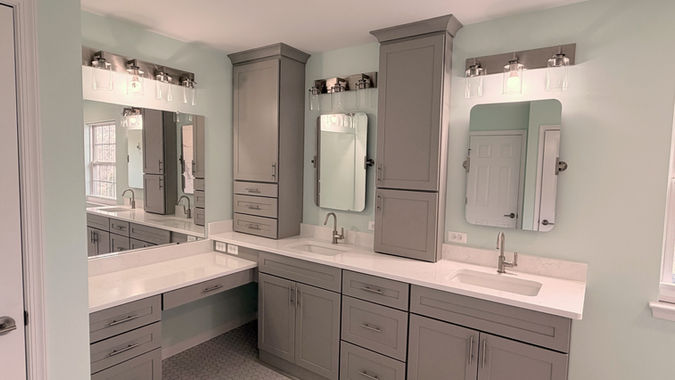 Primary bathroom with curb-less walk-in shower, mosaic floor, stand-alone tub, and upper wall cabinets.